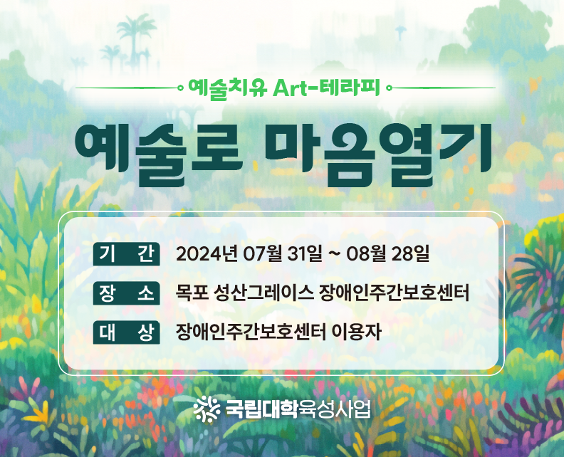 Àü³²´ëÇб³ ¼ºñ½ºµðÀÚÀÎÀ¶ÇÕ¿¬±¸¼Ò°¡ ÁÖÃÖ/ÁÖ°üÇϰí, BK21 ÈÞ¸ÕÄɾî Áö´ÉÇü ¹®È¿¹¼úÄÜÅÙÃ÷ÀÇ µðÀÚÀÎÀ¶ÇÕÀÎÀç ¾ç¼º ±³À°¿¬±¸´Ü(¾ÆÆ®&µðÀÚÀÎÅ×Å©³î·ÎÁö Çùµ¿°úÁ¤)°ú ¸ñÆ÷½Ã ¼º»ê±×·¹À̽º Àå¾ÖÀÎÁÖ°£º¸È£¼¾ÅͰ¡ ÇùÁ¶ÇÏ´Â Áö¿ª¹Î ´ë»ó ¿¹¼ú³ª´®¡®¿¹¼úÄ¡À¯ Art-Å×¶óÇÇ¡¯ ÇÁ·Î±×·¥À» ¡®¿¹¼ú·Î ¸¶À½¿±â'¶ó´Â ÁÖÁ¦·Î ¿î¿µÇÕ´Ï´Ù.