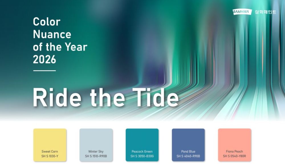 2026³â Ä÷¯´Ì¾Ó½º Ű¿öµå´Â '¶óÀ̵å ŸÀ̵å(Ride the Tide)'´Ù. ÀÌ´Â ¹«°æ°è(ÙíÌèÍ£)ÇÑ ¹°°á ¼Ó¿¡¼ Á÷°ü°ú »ó»ó·ÂÀ¸·Î »îÀÇ ¹æÇâÀ» ¼±ÅÃÇϰí, »õ·Î¿î ¸®µëÀ» ´À³¢¸ç ÀڽŸ¸ÀÇ Ç×·Î¿Í ¼Óµµ¸¦ ¸¸µé¾î°¡´Â °úÁ¤ÀÌ´Ù. »ïÈÆäÀÎÆ®´Â AI ¿¡ÀÌÀüÆ® µî »õ·Î¿î ¹°°áÀÌ ¹Ð·Á¿À´Â »óȲ¿¡¼, º¯È¸¦ µÎ·Á¿òÀÌ ¾Æ´Ñ ÇϳªÀÇ ¸®µëÀ¸·Î ¹Ù¶óº¸¸ç ±× ¼Ó¿¡ ¸öÀ» ½Ç¾îº¼ °ÍÀ» Á¦¾ÈÇϰí ÀÖ´Ù. Ű¿öµå¸¦ Ç¥ÇöÇϱâ À§ÇØ '½ºÀ ÄÜ(Sweet Corn)', 'À©ÅÍ ½ºÄ«ÀÌ(Winter Sky)', 'ÇÇÄÛ ±×¸°(Peacock Green)', 'Æùµå ºí·ç(Pond Blue)', 'ÇÇ¿À³ª ÇÇÄ¡(Piona Peach)'°¡ ¼±Á¤µÇ¾ú´Ù. °¢ Ä÷¯´Â »ó»ó·Â, À¯¿¬ÇÑ ÀûÀÀ, Á¶È¿Í ¿¬°á, ¹ÌÁöÀÇ ¹°°á, ÁøÁ¤¼º ÀÖ´Â ½Å·Ú¸¦ ÀǹÌÇÑ´Ù. ÀÌ Ä÷¯µéÀº ÇâÈÄ Àü½Ã, Á¦Ç° µðÀÚÀÎ, °ø°£ µðÀÚÀÎ, ±×·¡ÇÈ µðÀÚÀÎ µî ´Ù¾çÇÑ »ê¾÷°ú ºê·£µå¿¡¼ Àû¿ëµÉ ¿¹Á¤ÀÌ´Ù.