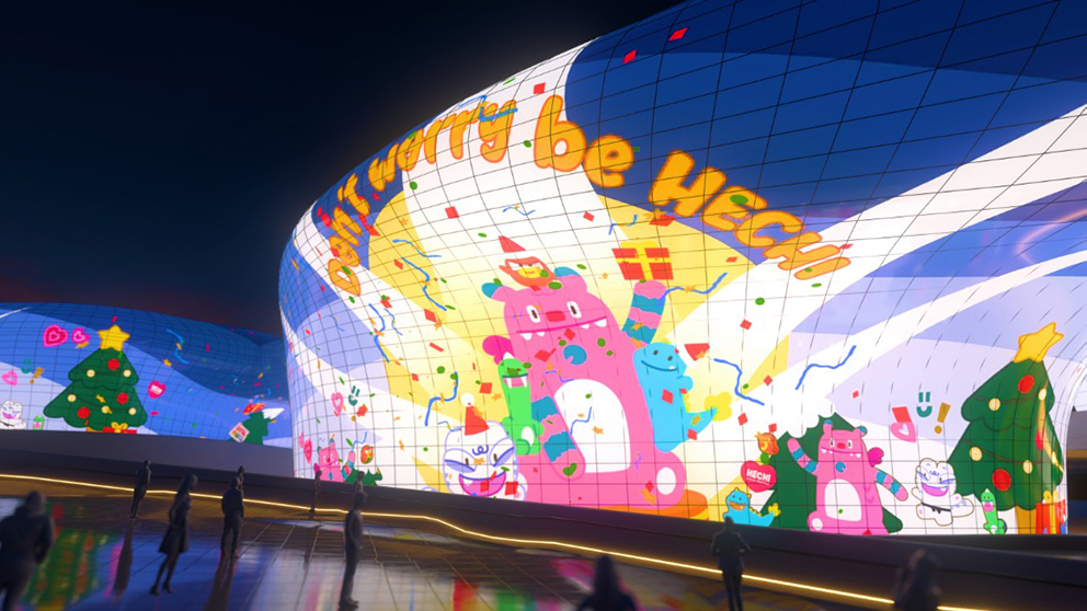 ¾à 222m¿¡ À̸£´Â DDP ¿Üº®¿¡´Â °¢±â ´Ù¸¥ ½ºÅ丮¸¦ °¡Áø Àαâ ij¸¯ÅͰ¡ ȸéÀ» ä¿ì°Ô µÈ´Ù. ù ¹øÂ° ¿µ»ó¿¡¼´Â ¼¿ïÀÇ ´ëÇ¥ ij¸¯ÅÍ ÇØÄ¡¿Í ÇÔ²² ¹éÈ£¡¤Çö¹«¡¤ÁÖÀÛ¡¤Ã»·æÀ» ¸ðƼºê·Î ÇÑ ¡®¼Ò¿ï ÇÁ·»Á°¡ µîÀåÇÑ´Ù. À̵éÀº È·ÁÇÑ ¿¬Ãâ È¿°ú¸¦ ÅëÇØ ¼¿ïÀ» ´ÜÁö µµ½Ã°¡ ¾Æ´Ñ, ½Ã¹ÎµéÀ» µû¶æÇÏ°Ô Ç°´Â º¸±ÝÀÚ¸®ÀÌÀÚ Èñ¸ÁÀÇ °ø°£À¸·Î ±×·Á³½´Ù. ¼±¸íÇÑ »ö°¨°ú ÆÐÅÏÀ¸·Î ¿¡³ÊÁö¸¦ ±Ø´ëÈÇϰí, ¸¶Áö¸·¿¡´Â "Don¡¯t Worry, Be Haechi(µ· ¿ö¸®, ºñ ÇØÄ¡)"¶ó´Â À¯ÄèÇÑ ¸Þ½ÃÁö·Î ´Ù°¡¿Ã »õÇØ¿¡ ´ëÇÑ ÀÀ¿ø°ú ±àÁ¤ÀÇ ¿¡³ÊÁö¸¦ ÀüÇÑ´Ù.