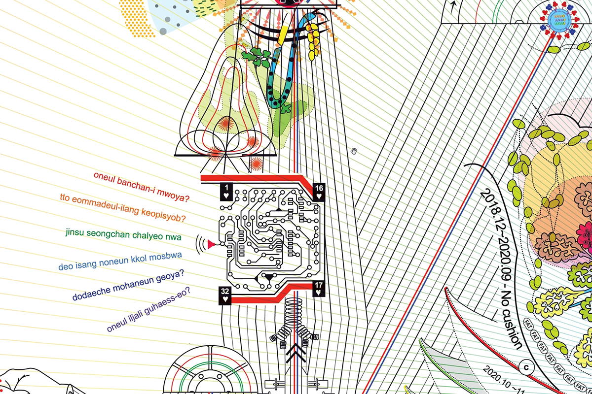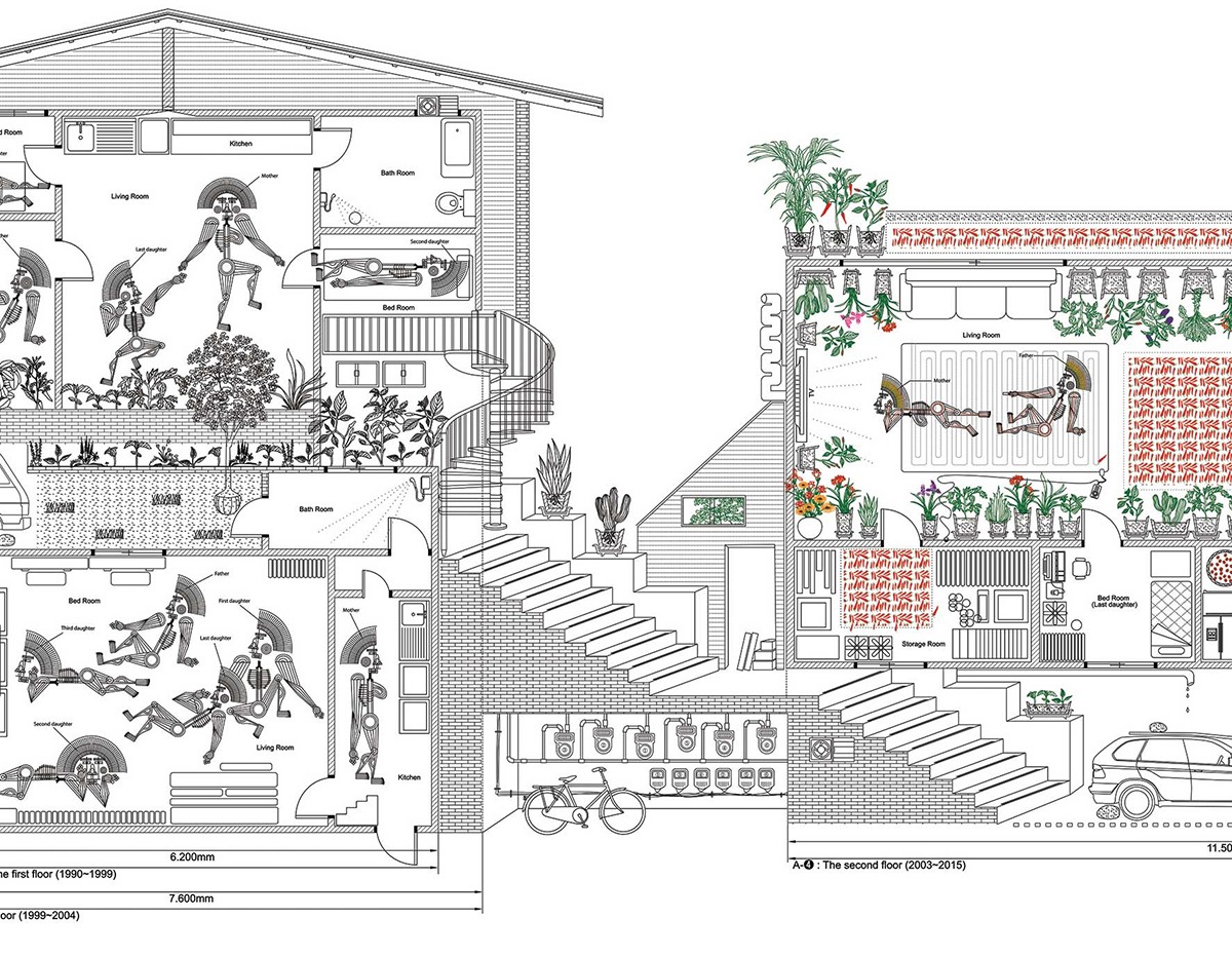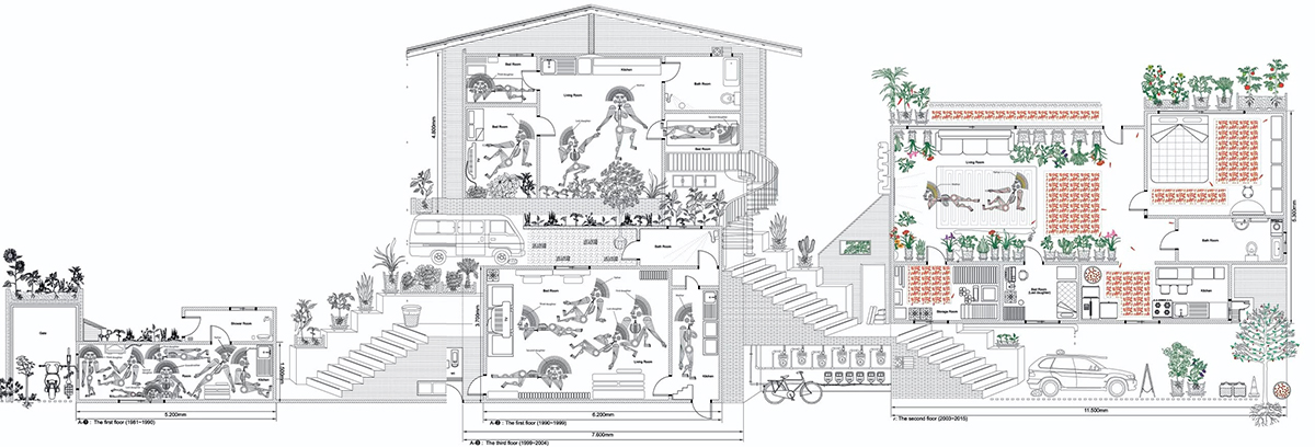 ¡®¿ì¸® Áý ¼¼ºÎµµ(Detailed Map of My House, 2015)¡¯¿¡´Â ÀÛ°¡°¡ 35³â µ¿¾È ÇÑ ´Ù°¡±¸ÁÖÅÿ¡¼ À̻縦 °ÅµìÇØ ¿Â °¡Á·ÀÇ ¿ª»ç¸¦ ´ãÀº ÀÛǰÀÌ´Ù. ÀÛǰ ¼Ó A-1ºÎÅÍ A-4±îÁöÀÇ Ç¥±â´Â 1981³â ÀÛ°¡ÀÇ Ãâ»ý ÀÌÈÄ °ÅÁÖ °ø°£ÀÇ º¯È¸¦ ½Ã°£¼øÀ¸·Î º¸¿©ÁØ´Ù. A-1Àº ºÎ¸ð´Ô°ú ³× ÀÚ¸Å, Ä£ÇҸӴϱîÁö Àϰö ¸íÀÌ »ì´ø ÀÛÀº ´ÜĹæÀ̸ç, A-2´Â ÇüÆíÀÌ Á¶±Ý ³ª¾ÆÁ® ¿·ÀÇ Á¶±Ý ´õ ³ÐÀº ¹æÀ¸·Î ¿Å±ä ¶§¸¦ ³ªÅ¸³½´Ù. A-3Àº 3Ãþ¿¡ »õ·Î ÁöÀº ÁýÀ¸·Î, ´ëÇб³ ±â¼÷»ç¿¡¼ »ì°Ô µÈ Å« ¾ð´Ï¸¦ Á¦¿ÜÇÑ ´Ù¼¸ ½Ä±¸°¡ ÇÔ²² »ì´ø °ø°£ÀÌ´Ù. A-4´Â ÀÚ³àµéÀÌ ¸ðµÎ µ¶¸³ÇÑ µÚ ºÎ¸ð´Ô µÎ ºÐ¸¸ ³ÐÀº 2Ãþ Áý¿¡ °ÅÁÖÇÏ´Â ÇöÀçÀÇ ¸ð½ÀÀ» ±×·È´Ù. ½Ä¹°À» Ű¿ì°í, ºñ¾î ÀÖ´Â °Å½Ç°ú ¹æ¿¡´Â °Ü¿ï ±èÀåÀ» À§ÇÑ ºÓÀº °íÃß°¡ ¹Ù´ÚÀ» ä¿ì°í ÀÖ´Â ¸ð½ÀÀ» Ç¥ÇöÇß´Ù.