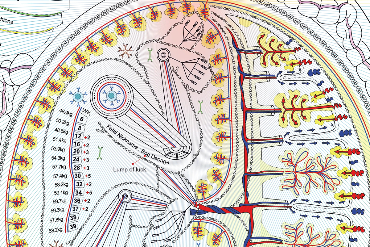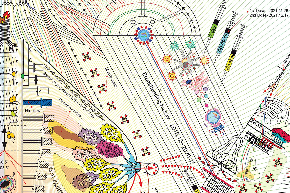 ¾ó¸¶ Àü, ÀÛǰ ¡®ÀÚÈ»ó-¶óÇÏÇÁ(Self-Portrait-Rachaph, 2024)¡¯´Â ±¹Á¦ÀûÀ¸·Î ÁÖ¸ñ ¹ÞÀ¸¸ç, ´º¿åÇö´ë¹Ì¼ú°ü(MOMA)¿¡ ¿µ±¸ ¼ÒÀåµÇ¾ú´Ù. 2007³â¿¡ ÀÚÈ»óÀ̶ó´Â Á¦¸ñÀ¸·Î ½Åü¸¦ ÇØºÎµµÃ³·³ ÇØ¼®ÇÑ ÀÛǰ ÀÌÈÄ, 2024³â¿¡´Â ¾ÆÀÌ µÑÀ» Ãâ»êÇÑ ÈÄ ¸öÀÇ º¯È¿Í Ãâ»ê, °¡Á·, ¸ð¼º, °ü°è ±â¾ï µî »îÀÇ °æÇèÀ» ¹Ý¿µÇÑ ÀÛǰÀ» Á¦ÀÛÇß´Ù. Rachaph´Â È÷ºê¸®¾î·Î ¡®º¸È£ÇÏ´Ù, ¾ËÀ» ǰ´Ù¡¯¶ó´Â Àǹ̷Π°¡Á·À» »ç¶ûÇÏ´Â ¸¶À½, º¸È£ÇÏ´Â ¸¶À½À» ¿¹¼ú·Î Ç¥ÇöÇß´Ù. ÀÛ°¡ÀÇ ¸öÀº °¡Á·ÀÇ Áöµµ°¡ µÇ¾î, ¸ð¼º¾Ö¸¦ ÀüÀÚ È¸·Îµµ¿Í À¶ÇÕÇØ ÀڽŸ¸ÀÇ ÃÊ»óȸ¦ ±×·È´Ù. ¸ðÀ¯ ¼öÀ¯, °Å²Ù·Î ´©¿öÀÖ´Â ¹è ¼Ó ¾ÆÀÌÀÇ ¸ð½À, Ãâ»ê ÈÄ ¿À¸¥ÆÈÀÌ µÈ ³²Æí, ¿ÞÆÈ¿¡´Â Ç×»ó ¾ö¸¶ °ç¿¡ Àִ ù° µþÀ», ¹è ¼Ó¿¡´Â ¾ÆÁ÷ žÁö ¾ÊÀº µÑ° µþÀ» Ç¥ÇöÇß´Ù. ¾ö¸¶°¡ µÈ ÈÄ º¯ÈÇÑ ¸Ó¸®Ä«¶ô°ú ¹é½Å ÁÖ»ç·Î ÀÎÇÑ ºÒ¾È°¨À» Ç¥ÇöÇϰųª, ÇÑ±Û ¹ßÀ½À» ±×´ë·Î ¿µ¾î·Î Ç¥±âÇÏ¿© ³²Æí°úÀÇ ´ëÈ ³»¿ëÀ» À¯¸Ó·¯½ºÇÏ°Ô Ç¥ÇöÇϸé¼, ÀڽŸ¸ÀÇ À̾߱⸦ Àü´ÞÇÑ´Ù.
