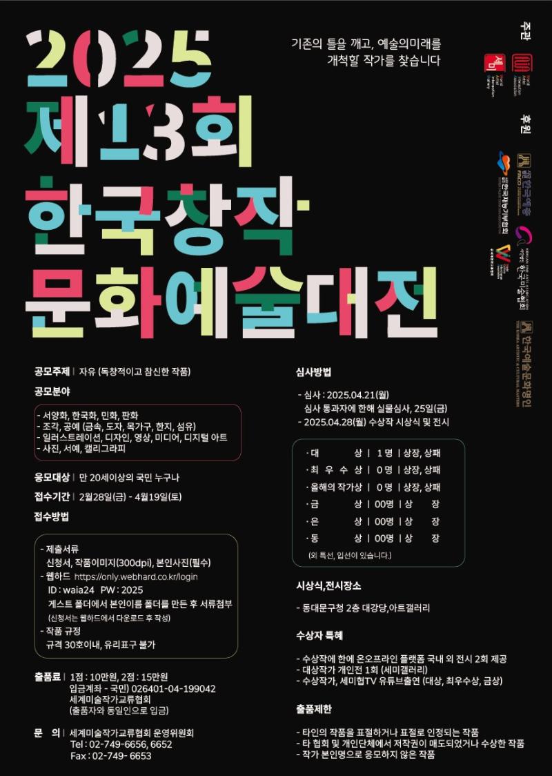 ¼¼°è¹Ì¼úÀÛ°¡±³·ùÇùÈ¿¡¼ ÁÖÃÖÇÏ´Â '2025Á¦13ȸ Çѱ¹Ã¢ÀÛ ¹®È¿¹¼ú´ëÀü'ÀÌ ½ÃÀ۵Ǿú½À´Ï´Ù.