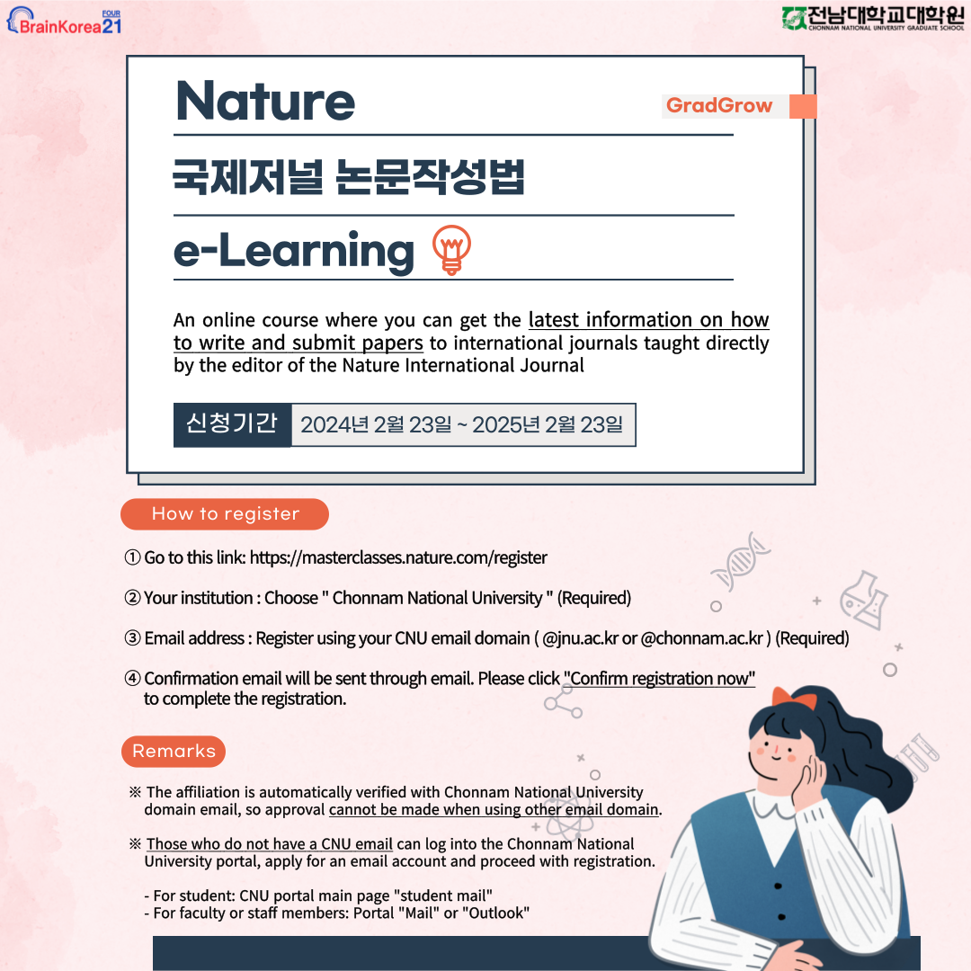 ±¹Á¦Àú³Î Nature ¿¡µðÅͰ¡ Á÷Á¢ °ÀÇÇÏ´Â ±¹Á¦Àú³Î ³í¹®ÀÛ¼º¹ý°ú Åõ°í¹ý, ±×¸®°í ¿¬±¸³í¹®À» À§ÇÑ ÃÖ½ÅÁ¤º¸¸¦ »ó½Ã ¼ö°ÇÏ½Ç ¼ö ÀÖµµ·Ï ¿Â¶óÀÎ °úÁ¤À» Á¦°øÇÏ¿À´Ï ¾Æ·¡ ³»¿ëÀ» ÂüÁ¶ÇϽñ⠹ٶø´Ï´Ù.¡Û ¿î¿µÀÏÁ¤: '24³â 2¿ù 24ÀÏ (±Ý) ~ '25³â 2¿ù 23ÀÏ (±Ý) 1³â°£ »ó½Ã ¼ö° °¡´É¡Û ¿î¿µ´ë»ó: Çг» Çй®ÈļӼ¼´ë (´ëÇпø»ý, ½ÅÁø¿¬±¸ÀηÂ), ±³¼ö, ±³Á÷¿ø µî Àü³²´ëÇб³ ±¸¼º¿ø¡Û ¿î¿µ³»¿ë - Àü³²´ë ¼Ò¼ÓÀ¸·Î µî·Ï ¿Ï·á½Ã Nature¿¡¼ ¿î¿µÇÏ´Â Nature Masterclass Online °úÁ¤ Á¦°ø ( https://masterclasses.nature.com ) - 10~15ºÐÀÇ ÂªÀº ¼ö¾÷À¸·Î ±¸¼ºµÇ¾î ÀÖ¾î ¹Ù»Û ¿¬±¸Àڵ鵵 ½±°Ô ¼ö° °¡´É - ³í¹®ÀÛ¼º Ãʺ¸ºÎÅÍ ³í¹® °æÇèÀÌ ¸¹Àº ¿¬±¸ÀÚ±îÁö ´Ù¾çÇÑ ´ë»óÀ¸·Î °ÀÇ Á¦°ø - ¿µ¾îÀÚ¸· ¹× ´ëº» Á¦°øhttps://webgs.jnu.ac.kr/Webapp/web/HOM/COM/Program/RegProgram.aspx?Mode=View&Seq=1237
