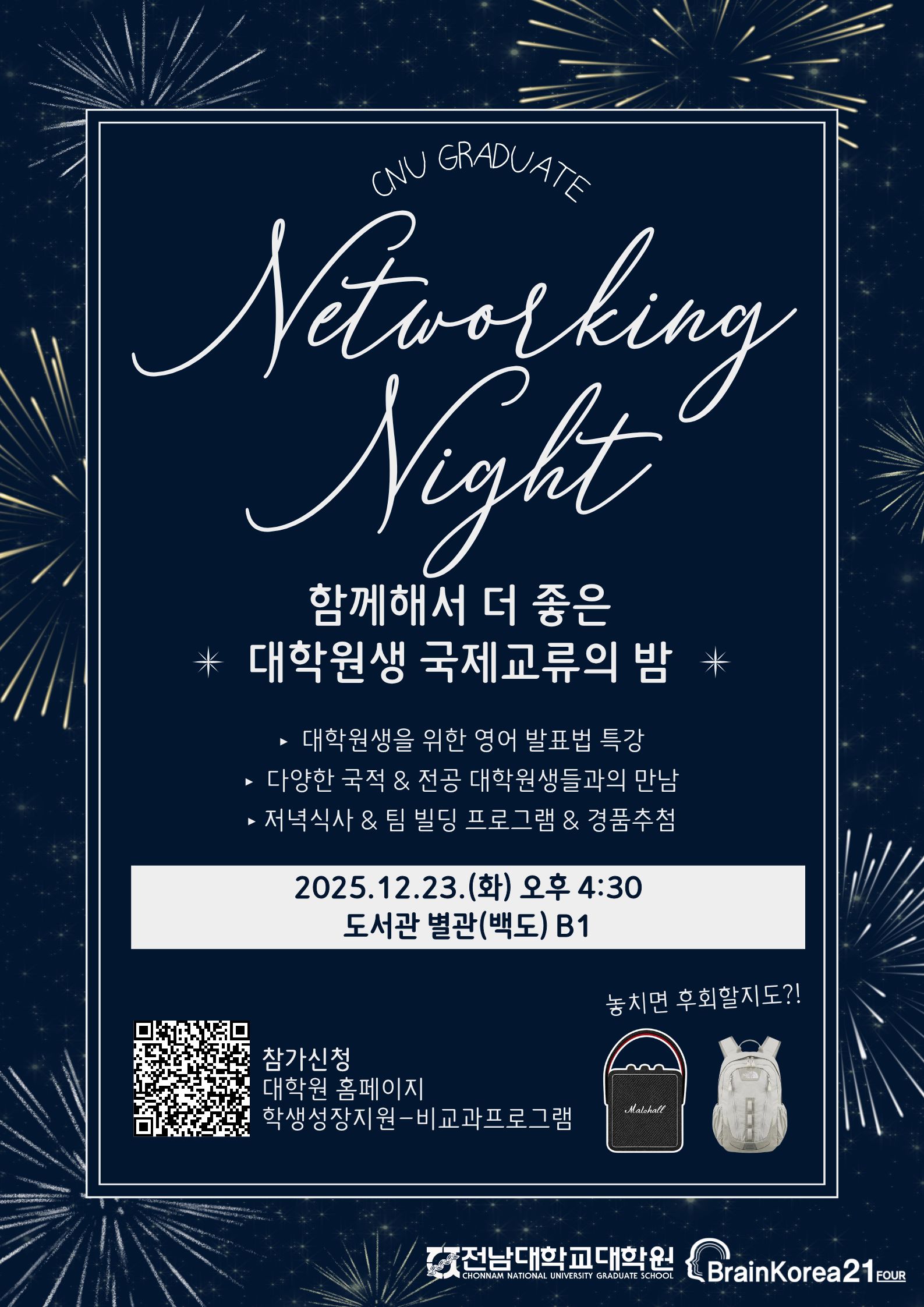 2025 Graduate Networking Night (´ëÇпø»ý ±³·ùÀÇ ¹ã)¿¡ ¿©·¯ºÐÀ» ÃÊ´ëÇÕ´Ï´Ù! Àü°ø°ú ±¹ÀûÀ» ¶Ù¾î³Ñ´Â ±³·ùÀÇ ÀåÀ¸·Î, Çѱ¹ÀÎ & ¿Ü±¹ÀÎ ¸ðµÎ ȯ¿µÇÕ´Ï´Ù. Çà»ç ¾È³»- Âü¿©´ë»ó: ³»¿Ü±¹ÀÎ ´ëÇпø»ý ¹× ½ÅÁø¿¬±¸ÀηÂ- ÀϽÃ: 2025. 12. 23.(È) 16:30~22:00- Àå¼Ò: µµ¼°ü º°°ü(¹éµµ) ÁöÇÏ 1Ãþ Ãë¾÷°Àǽǥ±- ÁøÇà¾ð¾î: ¿µ¾îÇÁ·Î±×·¥ ³»¿ë- Ư°: ¿µ¾î ³í¹® ¹ßÇ¥¹ý- ³×Æ®¿öÅ·: ´Ù¾çÇÑ ºÐ¾ßÀÇ Âü°¡ÀÚµé°ú ±³·ù- Àú³á½Ä»ç & ÆÀ Ȱµ¿: ¸ÀÀÖ´Â ½Ä»ç¿Í ÆÀ ºôµù ¾×ƼºñƼ🎁 ¸ðµç Âü°¡ÀÚ¿¡°Ô ±â³äǰ(´Üüº¹) ÁõÁ¤!Âü°¡¸¦ ¿øÇϽøé, ¾Æ·¡ Á¤º¸¸¦ ÀÛ¼ºÇÑ ÈÄ '½ÅûÇϱâ' ¹öưÀ» ´·¯ÁÖ¼¼¿ä.¹®ÀÇ: jje0727@jnu.ac.kr / 062-530-5915