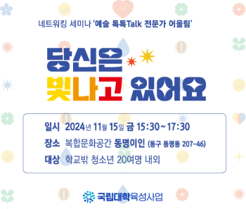 Àü³²´ëÇб³ ¼ºñ½ºµðÀÚÀÎÀ¶ÇÕ¿¬±¸¼Ò°¡ ÁÖÃÖ/ÁÖ°üÇϰí, BK21 ÈÞ¸ÕÄɾî Áö´ÉÇü ¹®È¿¹¼úÄÜÅÙÃ÷ÀÇ µðÀÚÀÎÀ¶ÇÕÀÎÀç ¾ç¼º ±³À°¿¬±¸´Ü(¾ÆÆ®&µðÀÚÀÎÅ×Å©³î·ÎÁö Çùµ¿°úÁ¤)ÀÌ ÇùÁ¶ÇÏ´Â ³×Æ®¿öÅ· ¼¼¹Ì³ª¡®¿¹¼ú ÅåÅåTalk Àü¹®°¡ ¾î¿ï¸²¡¯ÇÁ·Î±×·¥À» ¡®´ç½ÅÀº ºû³ª°í ÀÖ¾î¿ä¡¯¶õ ÁÖÁ¦·Î ¿î¿µÇÏ¿À´Ï ¸¹Àº °ü½É ºÎʵ右´Ï´Ù.