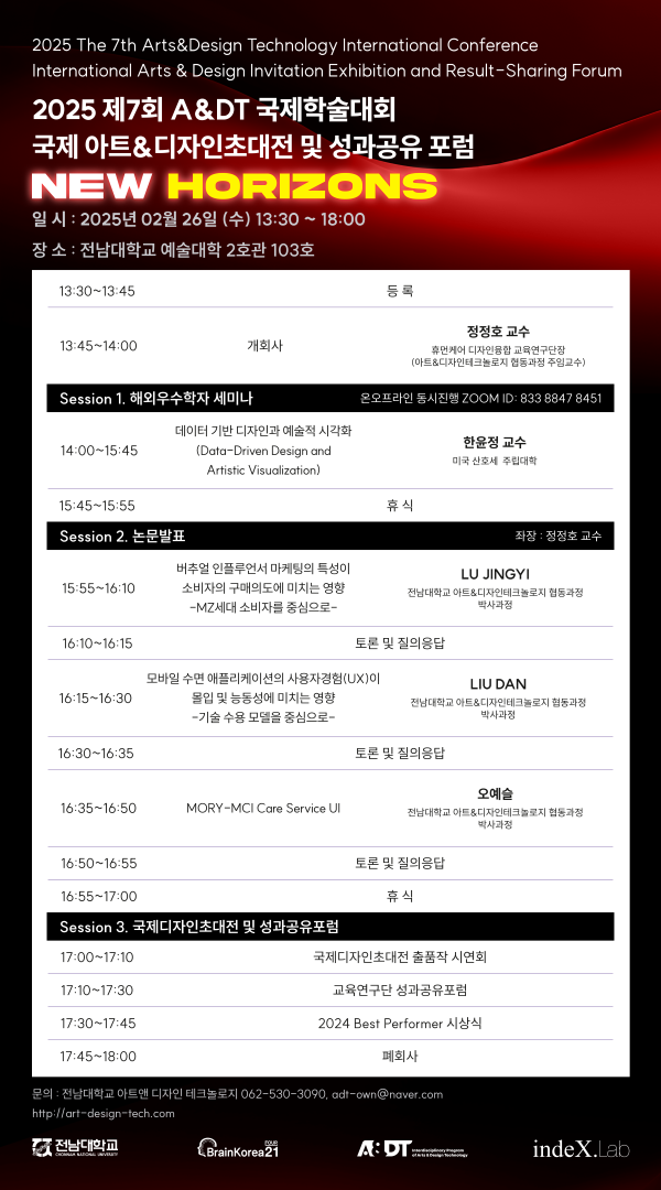 Àü³²´ëÇб³ BK21 ÈÞ¸ÕÄɾî Áö´ÉÇü ¹®È¿¹¼úÄÜÅÙÃ÷ÀÇ µðÀÚÀÎÀ¶ÇÕÀÎÀç ¾ç¼º ±³À°¿¬±¸´Ü, ¾ÆÆ®&µðÀÚÀÎÅ×Å©³î·ÎÁö Çùµ¿°úÁ¤ ¹× ¼ºñ½ºµðÀÚÀÎÀ¶ÇÕ¿¬±¸¼Ò°¡ °øµ¿ ÁÖÃÖ¡¤ÁÖ°üÇÏ¿© 'Á¦7ȸ A&DT ±¹Á¦Çмú´ëȸ/±¹Á¦¾ÆÆ®&µðÀÚÀÎÃÊ´ëÀü ¹× ¼º°ú°øÀ¯Æ÷·³'À» ÁøÇàÇÕ´Ï´Ù. ÀÌ¿¡ ¸¹Àº °ü½É°ú Âü¿© ¹Ù¶ø´Ï´Ù.
