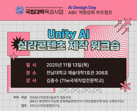 Àü³²´ëÇб³ ¿¹¼ú´ëÇаú Àü³²´ëÇб³ ¾ÆÆ®&µðÀÚÀÎÅ×Å©³î·ÎÁö Çùµ¿°úÁ¤(BK21 ÈÞ¸ÕÄɾî Áö´ÉÇü ¹®È¿¹¼úÄÜÅÙÃ÷ÀÇ µðÀÚÀÎÀ¶ÇÕÀÎÀç ¾ç¼º ±³À°¿¬±¸´Ü)ÀÌ ÁÖÃÖ/ÁÖ°üÇϰí Àü³²´ëÇб³ ¼ºñ½ºµðÀÚÀÎÀ¶ÇÕ¿¬±¸¼Ò°¡ ÇùÁ¶ÇÏ¿© ÁøÇàÇÏ´Â ¡®Unity AI ½Ç°¨ÄÜÅÙÃ÷ Á¦ÀÛ ¿öÅ©¼ó¡¯¿¡ ¸¹Àº Âü¿© ¹Ù¶ø´Ï´Ù.