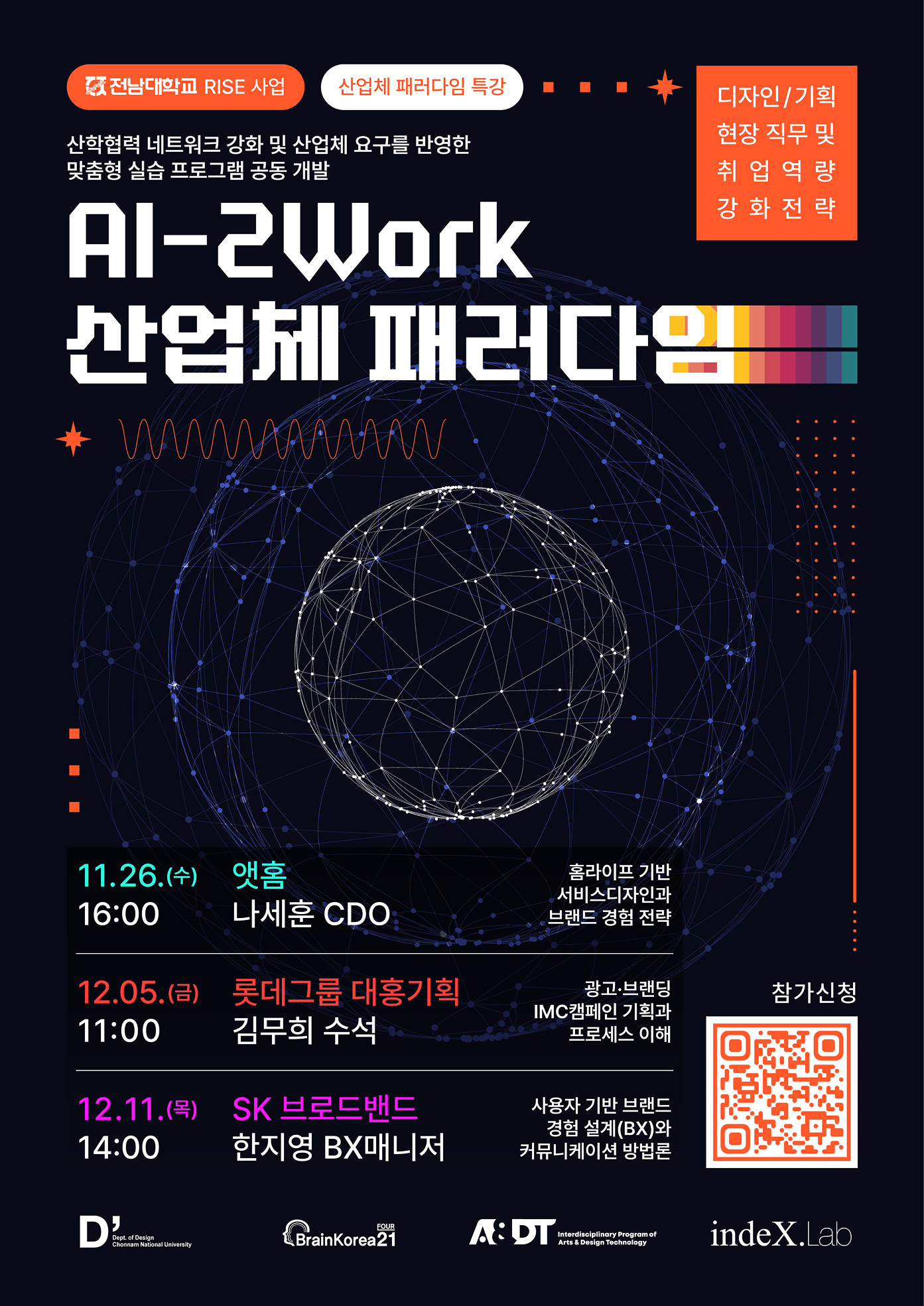 Àü³²´ëÇб³ µðÀÚÀÎÇаú¿Í Àü³²´ëÇб³ ¾ÆÆ®&µðÀÚÀÎÅ×Å©³î·ÎÁö Çùµ¿°úÁ¤(BK21 ÈÞ¸ÕÄɾî Áö´ÉÇü ¹®È¿¹¼úÄÜÅÙÃ÷ÀÇ µðÀÚÀÎÀ¶ÇÕÀÎÀç ¾ç¼º ±³À°¿¬±¸´Ü)ÀÌ ÁÖÃÖ/ÁÖ°üÇϰí Àü³²´ëÇб³ ¼ºñ½ºµðÀÚÀÎÀ¶ÇÕ¿¬±¸¼Ò°¡ ÇùÁ¶ÇÏ¿© ÁøÇàÇÏ´Â ¡®AI-2Work »ê¾÷ü ÆÐ·¯´ÙÀÓ¡¯¿¡ ¸¹Àº Âü¿© ¹Ù¶ø´Ï´Ù.