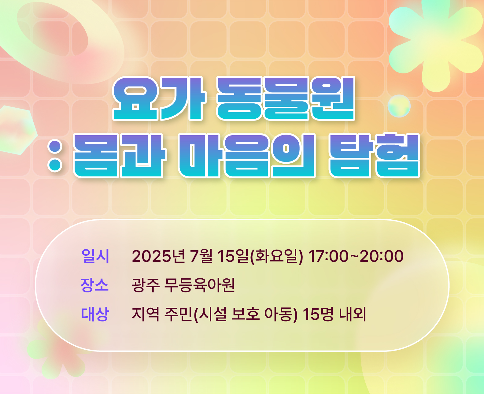 ¢ºÇÁ·Î±×·¥¸í: '¿ä°¡µ¿¹°¿ø ¸ö°ú ¸¶À½ÀÇ Å½Çè'¢ºÀϽÃ: 2025³â 07¿ù 15ÀÏ(È) 17:00~20:00¢ºÀå¼Ò: ±¤ÁÖ ¹«µîÀ°¾Æ¿ø¢º´ë»ó : Áö¿ª ÁÖ¹Î(½Ã¼³ º¸È£ ¾Æµ¿) 15¸í ³»¿Ü¹®ÀÇ»çÇ×: ¢Ï062-530-3090