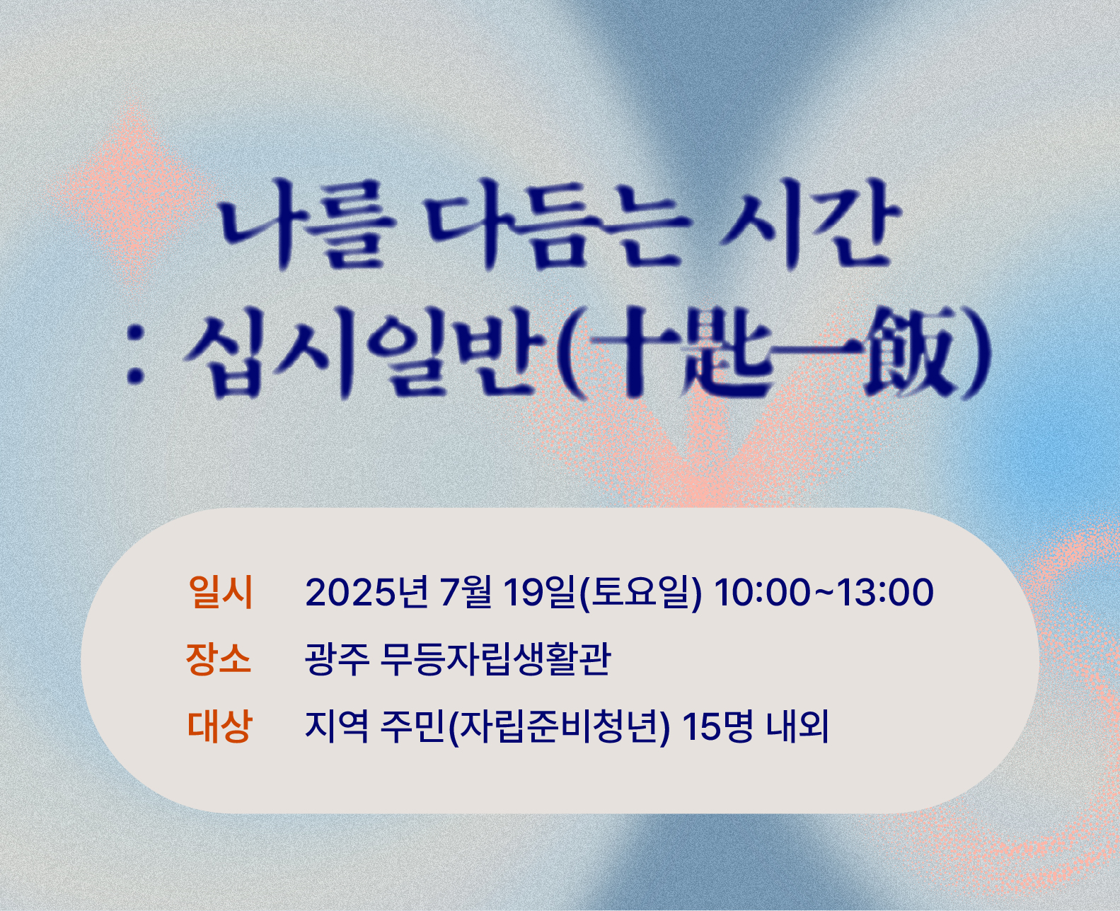 ¢ºÇÁ·Î±×·¥¸í: '³ª¸¦ ´Ùµë´Â ½Ã°£: ½Ê½ÃÀϹÝ(ä¨ãµìéÚù)'¢ºÀϽÃ: 2025³â 07¿ù 19ÀÏ(Åä) 10:00~13:00¢ºÀå¼Ò: ±¤ÁÖ ¹«µîÀÚ¸³»ýȰ°ü¢º´ë»ó : Áö¿ª ÁÖ¹Î(ÀÚ¸³Áغñû³â) 15¸í ³»¿Ü¹®ÀÇ»çÇ×: ¢Ï062-530-3090