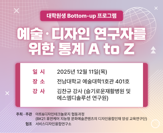 Àü³²´ëÇб³ ¾ÆÆ®&µðÀÚÀÎÅ×Å©³î·ÎÁö Çùµ¿°úÁ¤ (BK21 ÈÞ¸ÕÄɾî Áö´ÉÇü ¹®È¿¹¼úÄÜÅÙÃ÷ÀÇ µðÀÚÀÎÀ¶ÇÕÀÎÀç ¾ç¼º ±³À°¿¬±¸´Ü)ÀÌ ÁÖÃÖ/ÁÖ°üÇÏ°í ¼ºñ½ºµðÀÚÀÎÀ¶ÇÕ¿¬±¸¼Ò°¡ ÇùÁ¶ÇÏ¿© ÁøÇàÇÏ´Â ¡®¿¹¼ú ¡¤ µðÀÚÀÎ ¿¬±¸ÀÚ¸¦ À§ÇÑ Åë°è A to Z¡¯ ¸¦ °³ÃÖÇÕ´Ï´Ù.