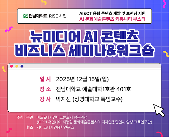 Àü³²´ëÇб³ RISE »ç¾÷´ÜÀÌ ÁÖÃÖÇÏ°í ¾ÆÆ®&µðÀÚÀÎÅ×Å©³î·ÎÁö Çùµ¿°úÁ¤(BK21 ÈÞ¸ÕÄɾî Áö´ÉÇü ¹®È¿¹¼úÄÜÅÙÃ÷ÀÇ µðÀÚÀÎÀ¶ÇÕÀÎÀç ¾ç¼º ±³À°¿¬±¸´Ü)ÀÌ ÁÖ°üÇÏ¸ç ¼ºñ½ºµðÀÚÀÎÀ¶ÇÕ¿¬±¸¼Ò°¡ ÇùÁ¶ÇÏ¿© ÁøÇàÇÏ´Â ¡®´º¹Ìµð¾î AI ÄÜÅÙÃ÷ ºñÁî´Ï½º ¼¼¹Ì³ª&¿öÅ©¼ó¡¯À» °³ÃÖÇÕ´Ï´Ù.
