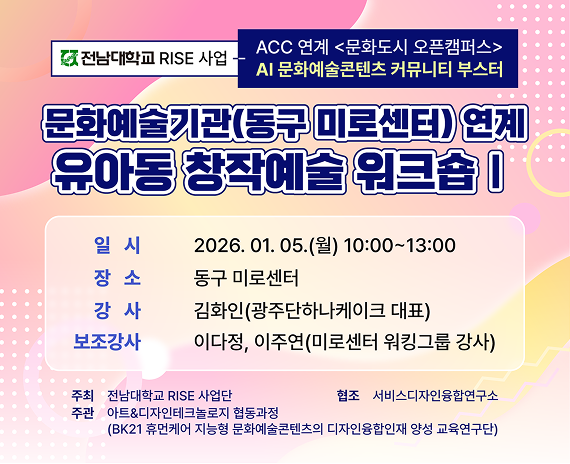 Àü³²´ëÇб³ RISE »ç¾÷´ÜÀÌ ÁÖÃÖÇÏ°í ¾ÆÆ®&µðÀÚÀÎÅ×Å©³î·ÎÁö Çùµ¿°úÁ¤(BK21 ÈÞ¸ÕÄɾî Áö´ÉÇü ¹®È¿¹¼úÄÜÅÙÃ÷ÀÇ µðÀÚÀÎÀ¶ÇÕÀÎÀç ¾ç¼º ±³À°¿¬±¸´Ü)ÀÌ ÁÖ°üÇÏ¸ç ¼ºñ½ºµðÀÚÀÎÀ¶ÇÕ¿¬±¸¼Ò°¡ ÇùÁ¶ÇÏ¿© ÁøÇàÇÏ´Â ¡®¹®È¿¹¼ú±â°ü(µ¿±¸ ¹Ì·Î¼¾ÅÍ) ¿¬°è À¯¾Æµ¿ âÀÛ¿¹¼ú ¿öÅ©¼ó ¥°¡¯À» °³ÃÖÇÕ´Ï´Ù.