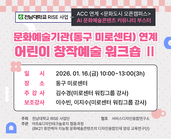 Àü³²´ëÇб³ RISE »ç¾÷´ÜÀÌ ÁÖÃÖÇÏ°í ¾ÆÆ®&µðÀÚÀÎÅ×Å©³î·ÎÁö Çùµ¿°úÁ¤(BK21 ÈÞ¸ÕÄɾî Áö´ÉÇü ¹®È­¿¹¼úÄÜÅÙÃ÷ÀÇ µðÀÚÀÎÀ¶ÇÕÀÎÀç ¾ç¼º ±³À°¿¬±¸´Ü)ÀÌ ÁÖ°üÇÏ¸ç ¼­ºñ½ºµðÀÚÀÎÀ¶ÇÕ¿¬±¸¼Ò°¡ ÇùÁ¶ÇÏ¿© ÁøÇàÇÏ´Â ¡®¹®È­¿¹¼ú±â°ü(µ¿±¸ ¹Ì·Î¼¾ÅÍ) ¿¬°è ¾î¸°ÀÌ Ã¢ÀÛ¿¹¼ú ¿öÅ©¼ó ¥±¡¯À» °³ÃÖÇÕ´Ï´Ù.