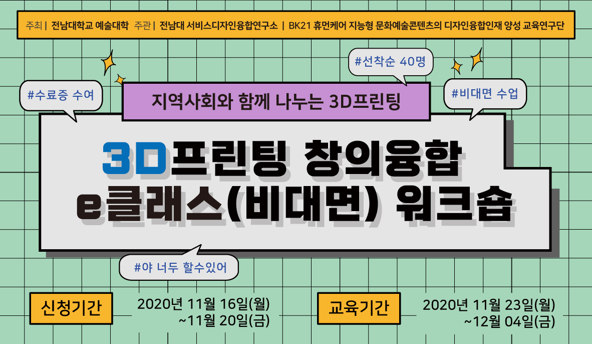 Àü³²´ë ¿¹¼ú´ëÇÐ(ÇÐÀå ±èö¿ì)Àº ¿À´Â 11¿ù 23ÀϺÎÅÍ ¿Â¶óÀÎ Ç÷§ÆûÀ» ÅëÇØ ¡®3DÇÁ¸°ÆÃ âÀÇÀ¶ÇÕ eŬ·¡½º(ºñ´ë¸é) ¿öÅ©¼ó¡¯À» ÁøÇàÇÑ´Ù.